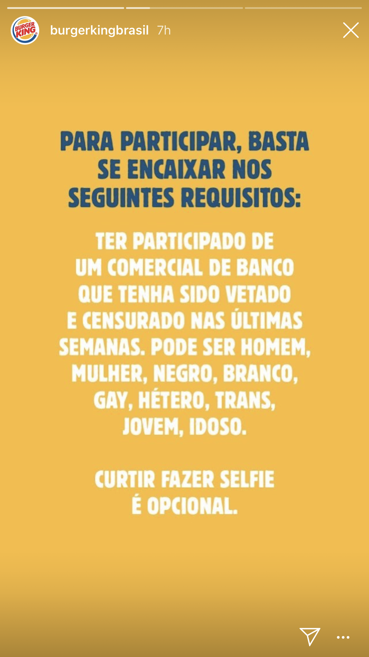 «Se busca elenco para comerciales. Burger King está reclutando gente para su nuevo negocio. Para participar basta con cumplir con los siguientes requisitos: haber participado en un comercial bancario y haya sido vetado y censurado en las últimas semanas. Puede ser hombre, mujer, negro, blanco, gay, heterosexual, trans, joven, anciano. Disfrutar de tomarse una selfie es opcional. El objetivo de la marca – que no tiene participación política – es mostrar que en Burger King todos son bienvenidos. Siempre. Para participar, basta con ponerse en contacto a través del correo electrónico: recruafilme@burgerking.com.br «, dice el comunicado.