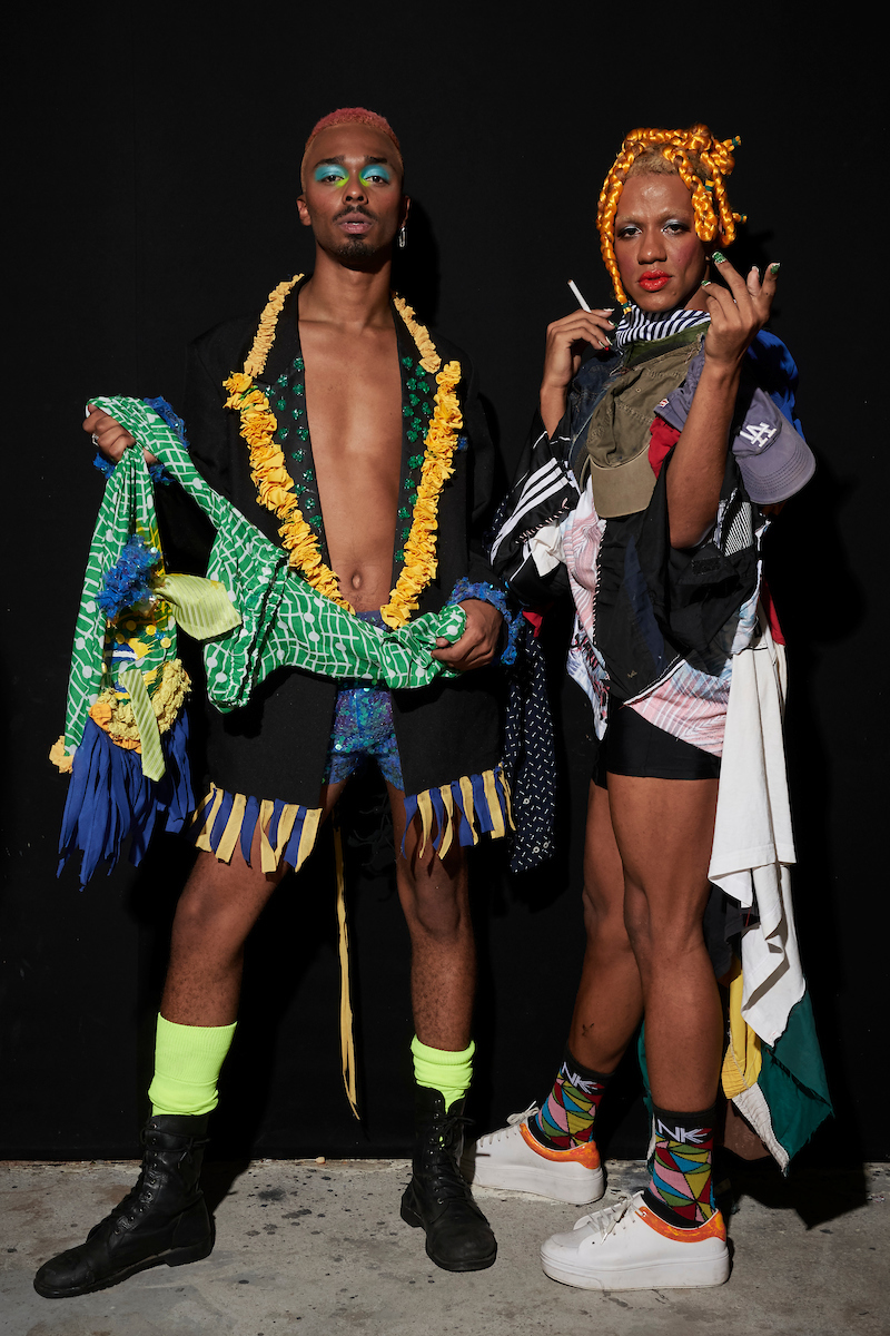 Estileras é uma estrutura artística guiada pela dupla não binária de artistas performáticas, transdisciplinares e multimeios, Boni e Brendy. Por meio da metáfora de uma “empresa”, projetam uma sátira metalinguística das estruturas tradicionais criando narrativas onde indivíduos dissidentes tornam-se protagonistas. Se debruçam sobre processos através da performance em contato com os resíduos da indústria da moda para construir novos corpos e existências. Nessa Casa de Criadores, as Estileras continuam a narrativa que nasceu na edição anterior com a colaboração de diversos artistas dissidentes e dos coletivos artísticos FudidaSilk (RJ) e Inserto (SP), que desenvolveram e aplicaram as estampas. Lá foram apresentados os ‘Manuais Estileras’, uma performance onde 30 pessoas por mais de 6 horas construíram ao vivo e na hora o que seria visto na passarela do evento. Os processos de estampar, recortar, talvez costurar, fazer styling, maquiar, colocar próteses e se alimentar, tudo aberto para que o público que circulava pela Praça das Artes pudesse acompanhar a realidade de uma produção como essa. Após focar no processo e suas relações, o olhar se dirige para os detalhes e as linhas gráficas que são a união dos três coletivos. A proposta não é produzir mais roupas mas afirmar o ‘reuso’. Repensar o que já está feito. Deformar expectativas para emergir novas perspectivas. E ampliar a visão da moda, onde os meios e formatos discursam junto aos corpos e tecidos. Com segurança reforçada novamente pelas Unusual.BR, as Estileras Fudidamente Insertas se apresentam em: ‘A Continuação…’