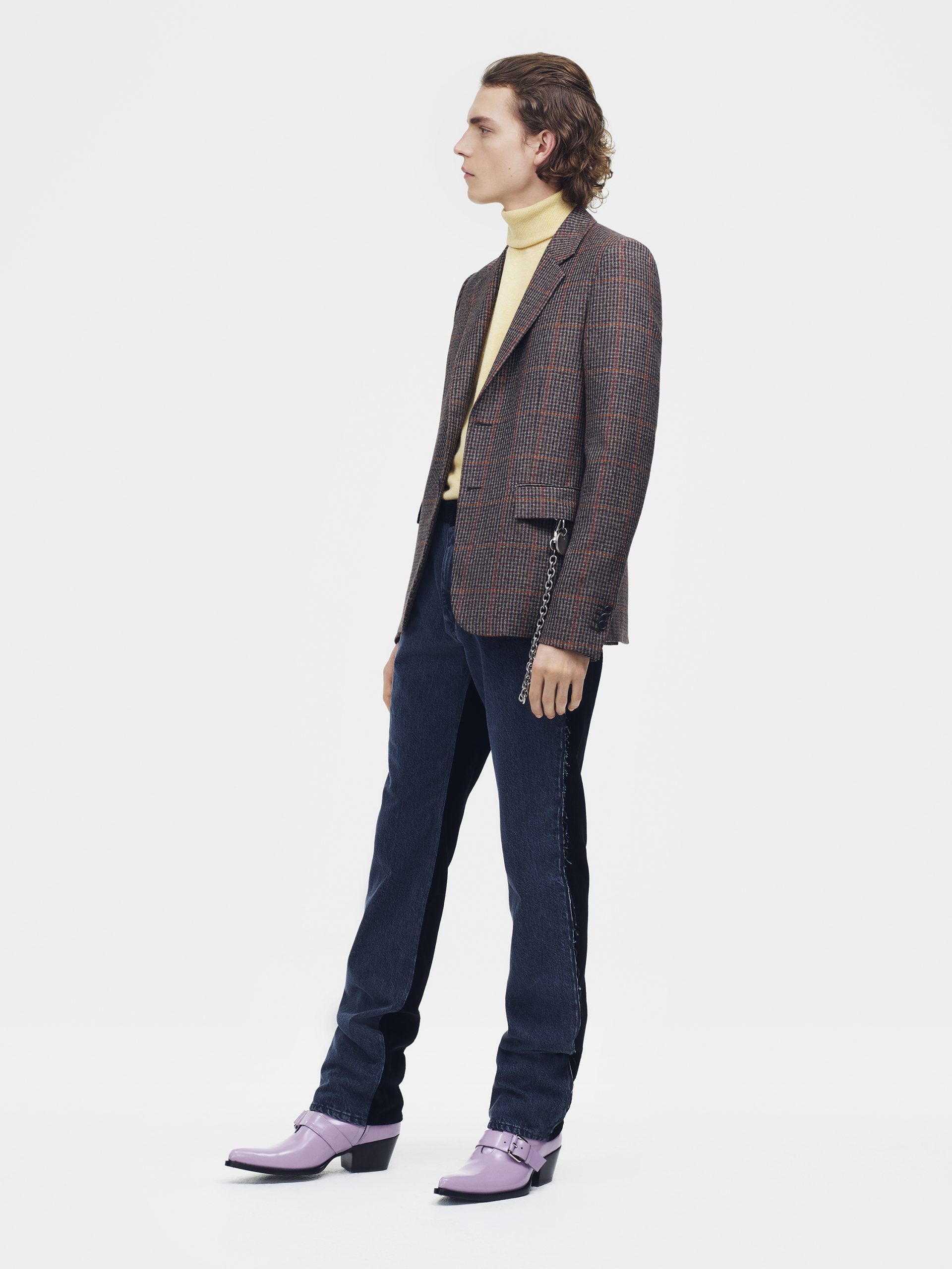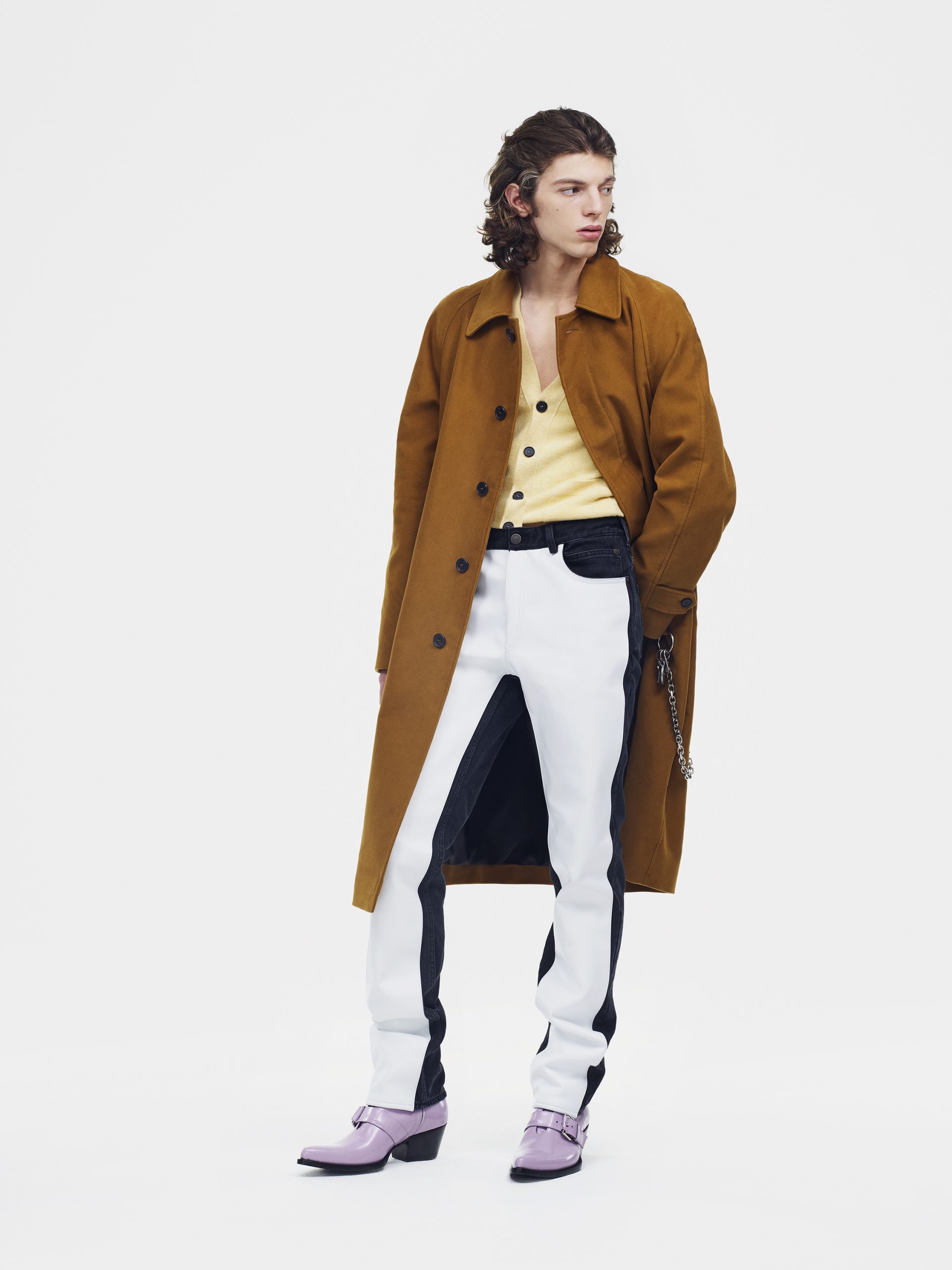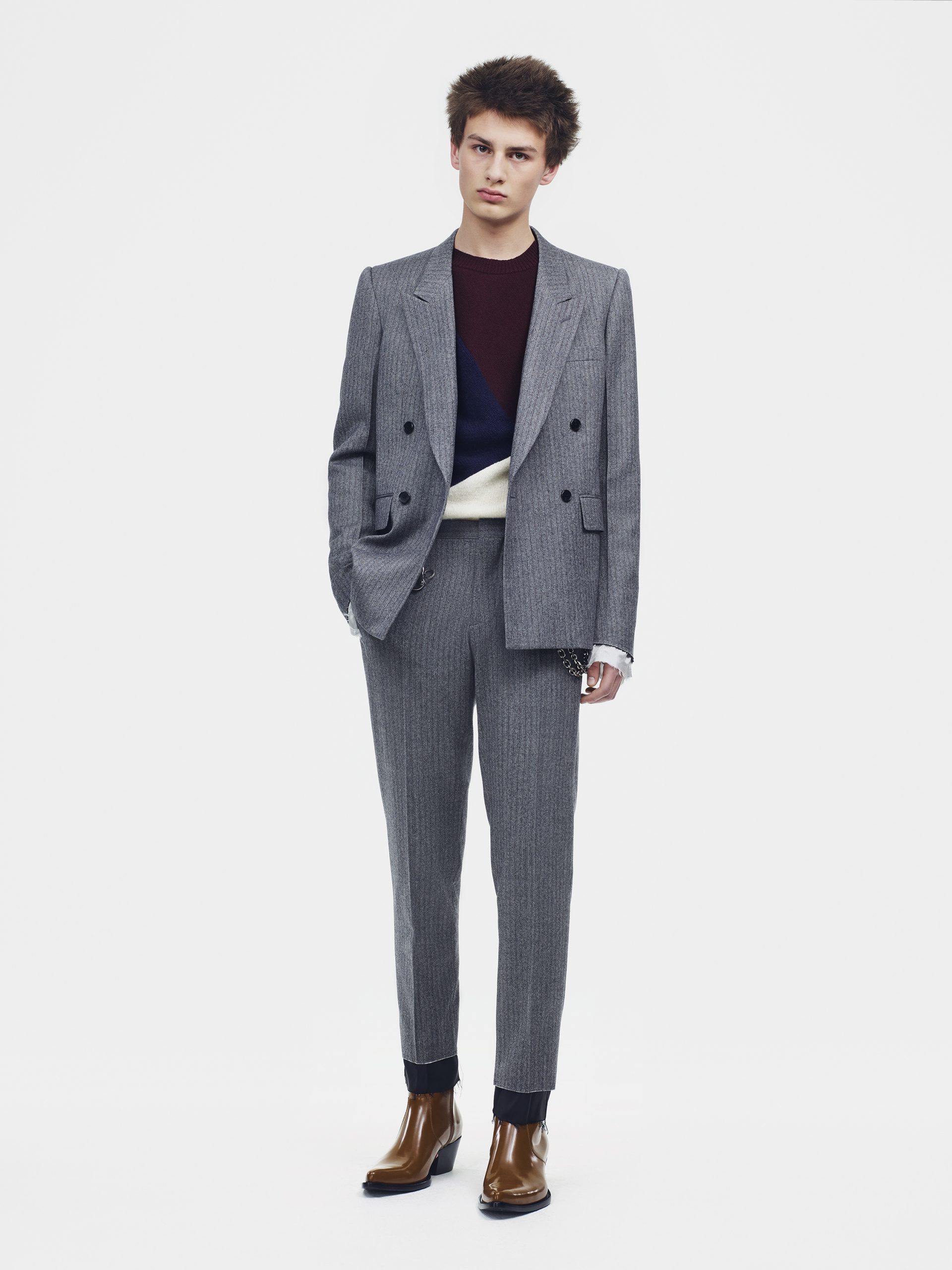 Os acessórios são polidos e focados. As bombas e as botas femininas têm um dedo apontado exagerado, com solas e saltos agulha moldados para sugerir viagens espaciais no meio do século, ou o chassi de automóveis americanos em acabamentos em patente e cromados. Esta estação lança o sapato SHIFT, um modelo de construção suave com um tecido tradicional de influência dos anos 70 fundido com uma sola magmática. A bolsa DALTON, uma alça superior estruturada com linhas diagonais fortes, é oferecida em uma multiplicidade de tamanhos, materiais e acabamentos, incluindo uma estampa de arte pop de um rosto de manequim, como um pôster de filme imaginado.