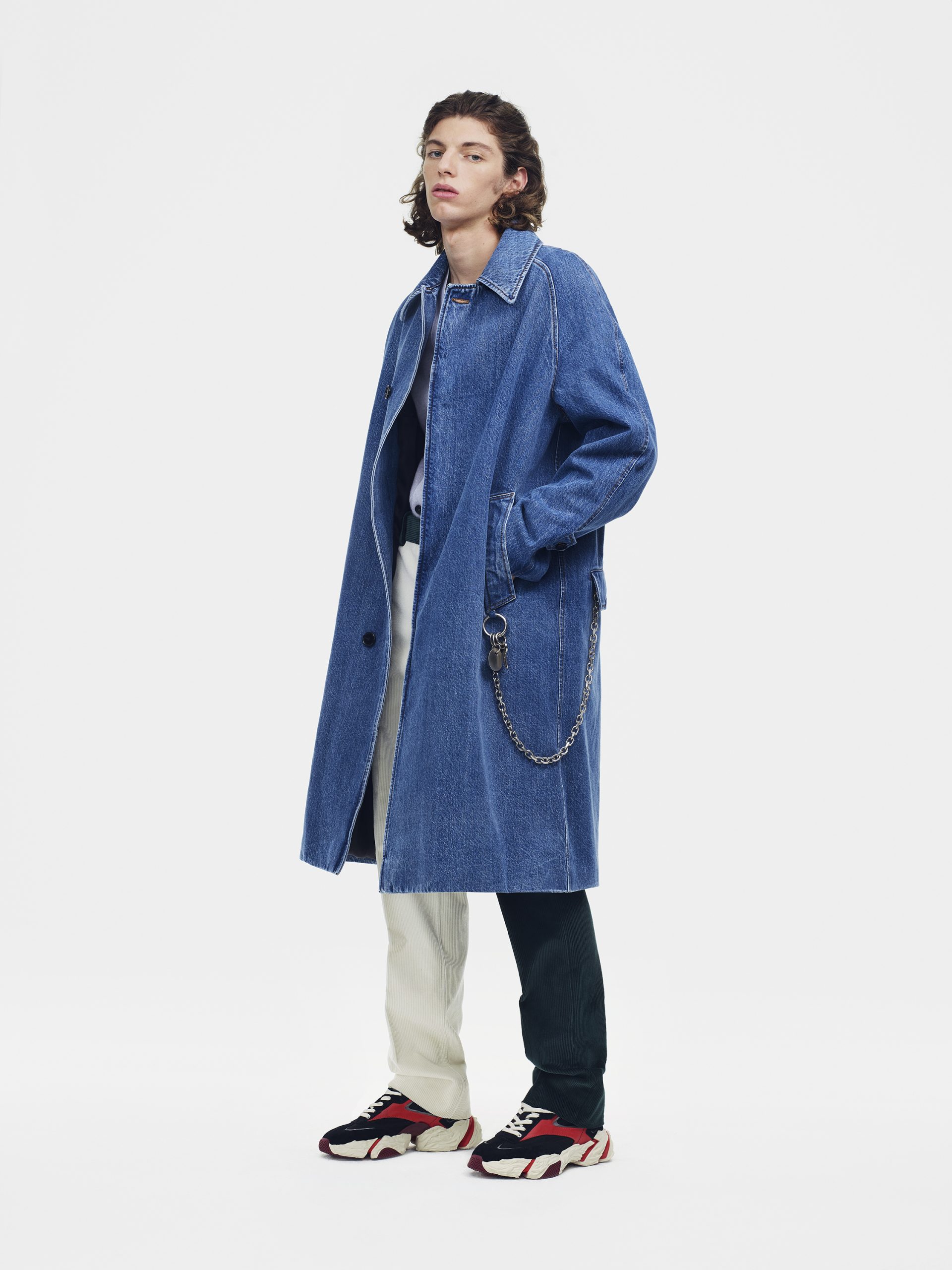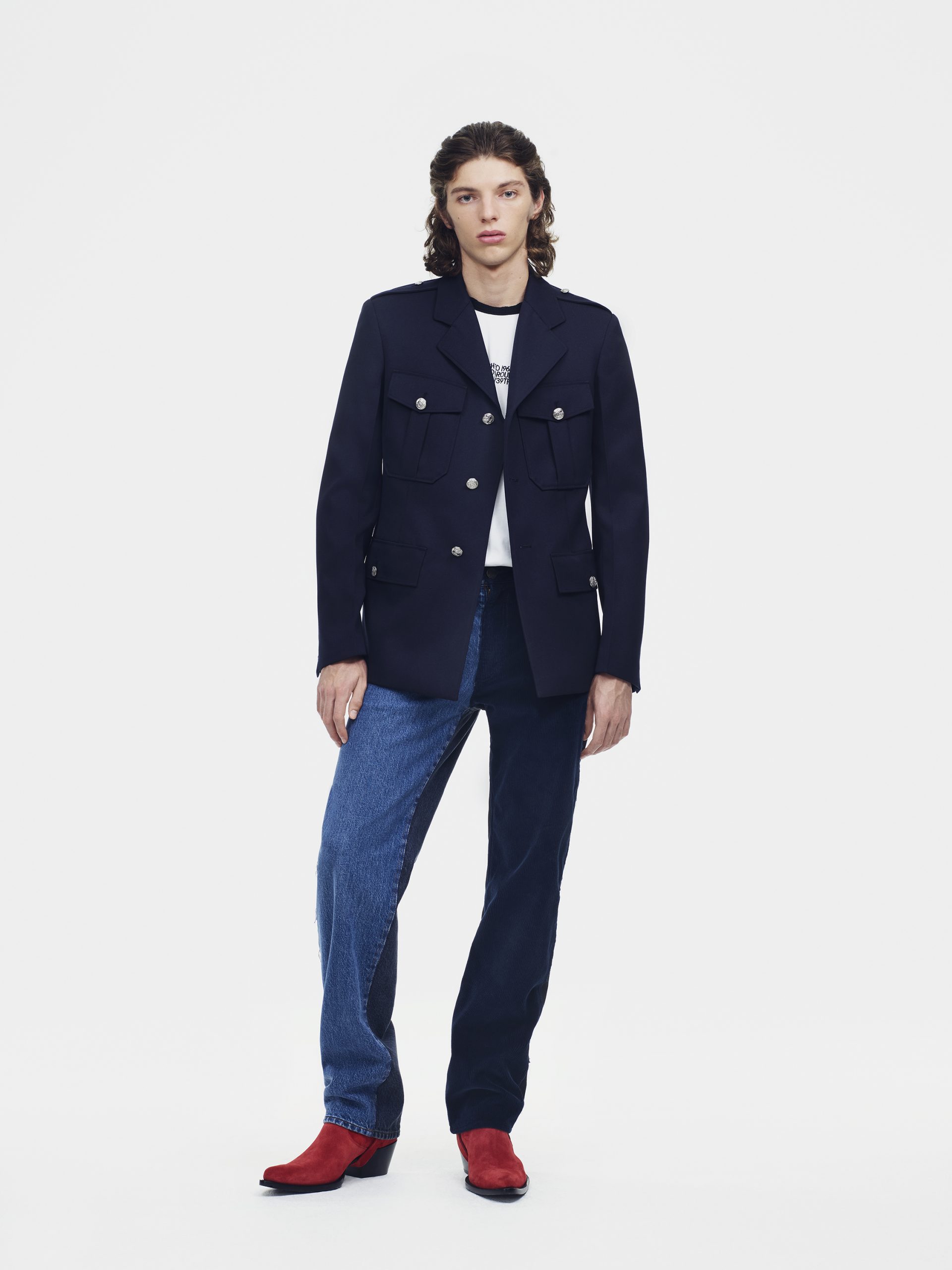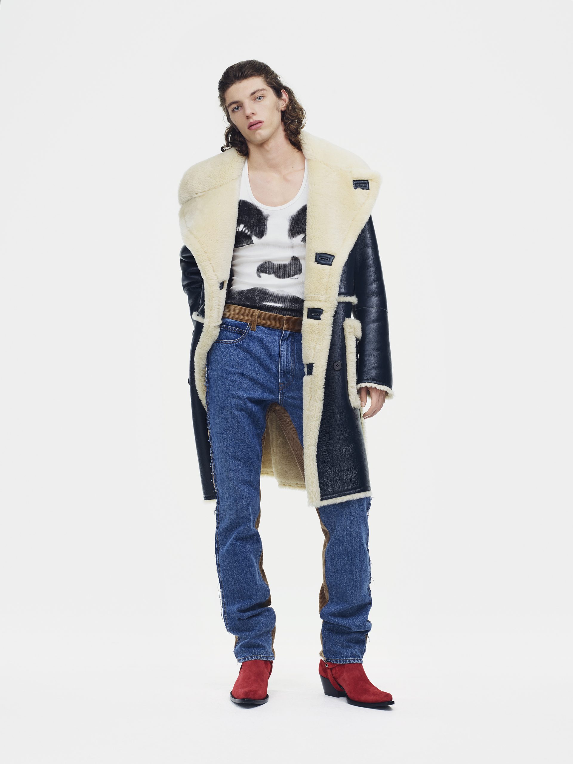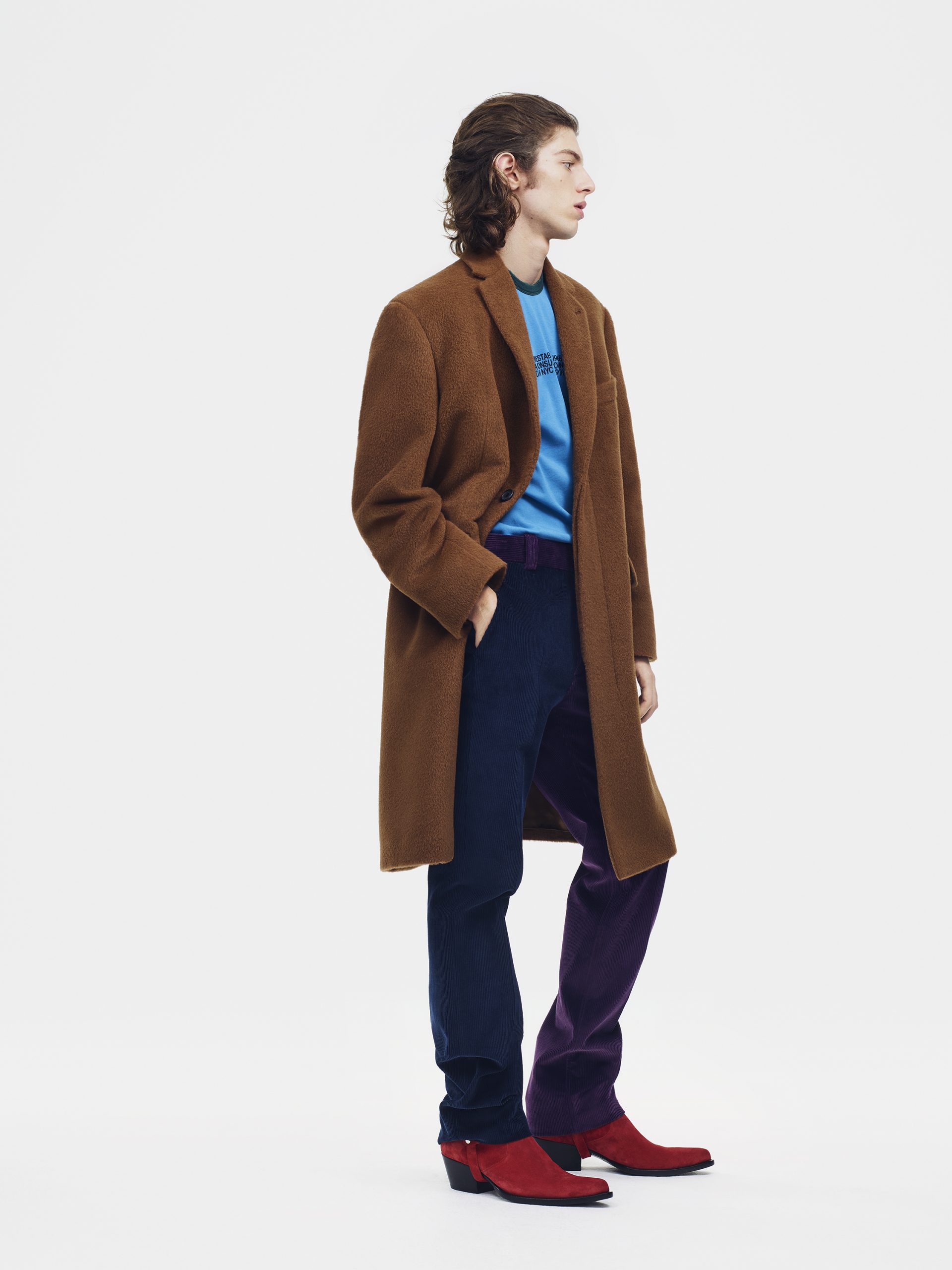 Evocando a colcha de retalhos americana que se tornou um emblema moderno da CALVIN KLEIN, as peças de vestuário são confeccionadas com diferentes tecidos, justapondo texturas e origens contrastantes: tweed contra denim e cores contrastantes de veludo cotelê. A paleta de cores é populista: batom vermelho, laranjas saturadas e rosas, chambray e azuis índigo, um espectro de neutros. Há uma abordagem sincera e atenciosa ao material: denim de algodão e veludo cotelê, alfaiataria de lã seca, cashmere luxuosos de dupla face, densos veludos e malhas de chenille. Sua tatilidade universal convida a pessoa a tocar e vestir.