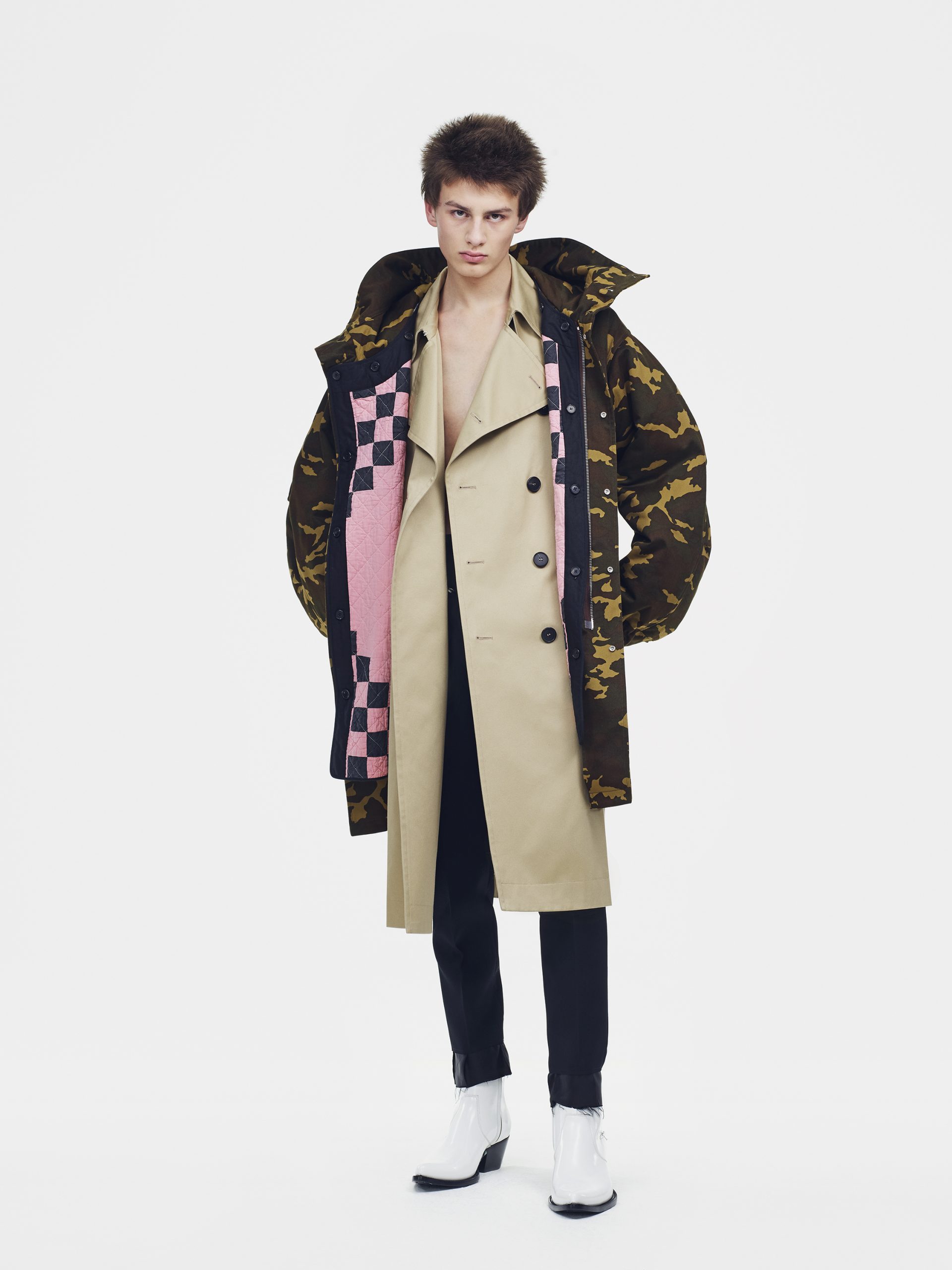 Uma sensibilidade americana informa tudo. Estrutura é iluminada. Formas geométricas simples tornam-se luxuosas, não estruturadas, capas de cashmere de dupla face e bolsas gráficas; sua forma é enfatizada em saias circulares impressas para emular as gravadoras LP. Trincheiras e casacos de cashmere inspirados nos arquivos da marca tornam-se novas âncoras para o vestuário exterior, simplificado junto ao corpo. Combinado com grandes parkas e jaquetas bomber, um novo conjunto de peças clássicas é criado.