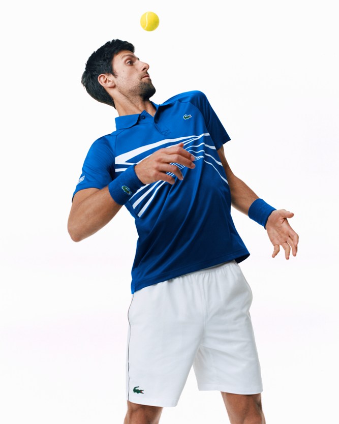Para a atuação de Novak Djokovic nas quadras de Melbourne, a LACOSTE desenvolveu dois uniformes que combinam azul royal e branco. Criados para dar liberdade de movimento, os materiais são leves e arejados com cortes ergonômicos. Uma estampa de linhas interrompidas, inspirada no tema da velocidade, dá a ilusão de perspectiva na parte da frente da polo em jérsei tecnológico com stretch. Combinada com um short de tafetá com stretch e costura contrastante, uma jaqueta tecnológica de zíper e um boné.