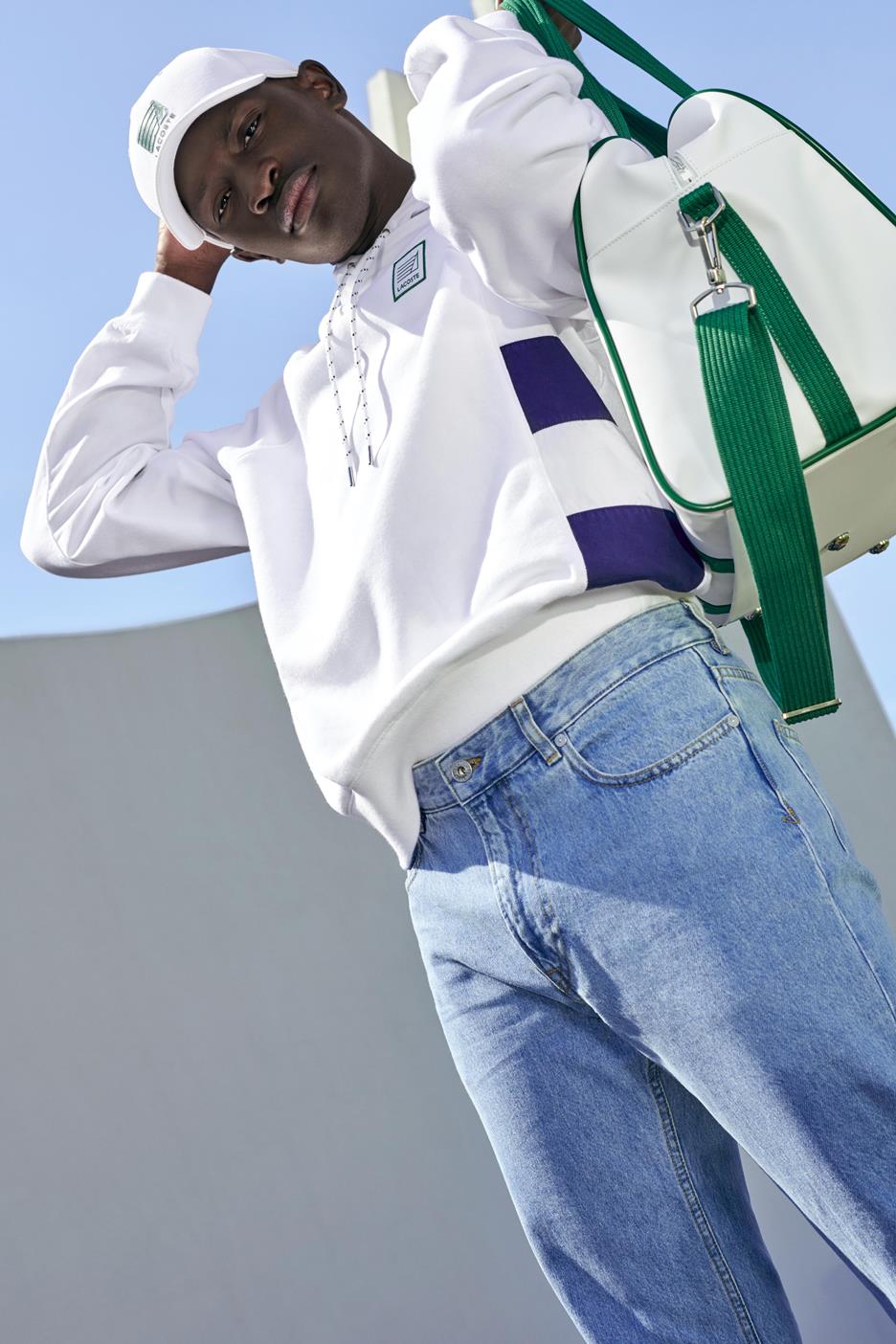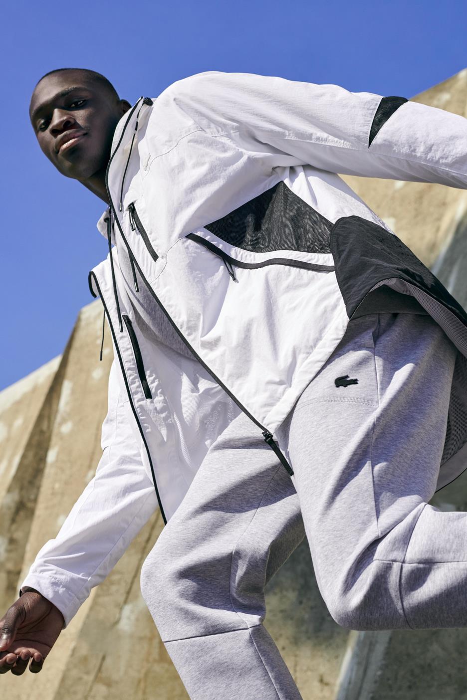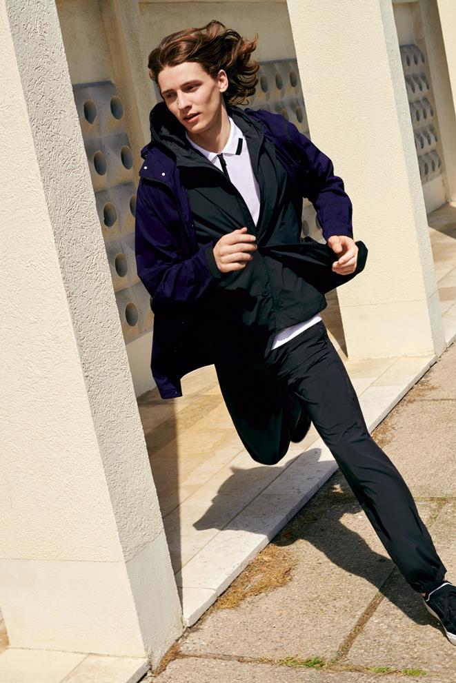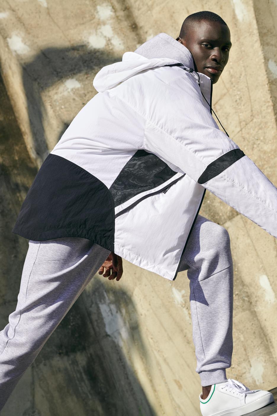 As silhuetas desta coleção são criadas para a ação. Feita de náilon preto com stretch, uma jaqueta com capuz é combinada com uma calça de sarja, para acompanhar os movimentos do corpo. Enquanto isso, uma jaqueta bomber com zíper, em fleece tricolor, e um moletom Milano azul e preto são usados com calça cenoura, para o máximo conforto.