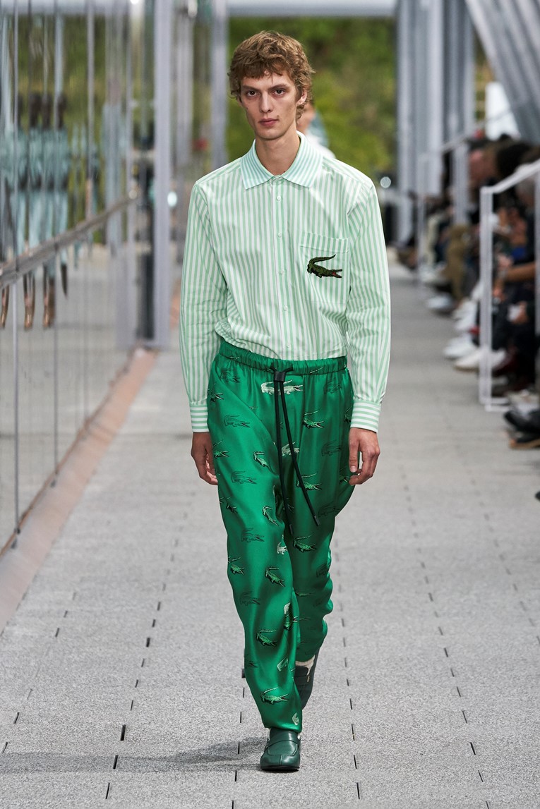 Peças originais para o tênis e para o golfe são retrabalhadas: uma lembrança íntima de John F. Kennedy Jr., pronto para o acampamento de verão em sua polo da Lacoste, evoca o clima de nostalgia, assim como o passeio de René Lacoste, de Dieppe a Deauville, com Suzanne Lenglen (uma campeã mundial conhecida por seu encanto dentro e fora das quadras). Proporções divertidas sugerem roupas que ainda estão grandes e outras que já não servem mais. A alfaiataria é essencial, refletindo os códigos passados da elegância esportiva.