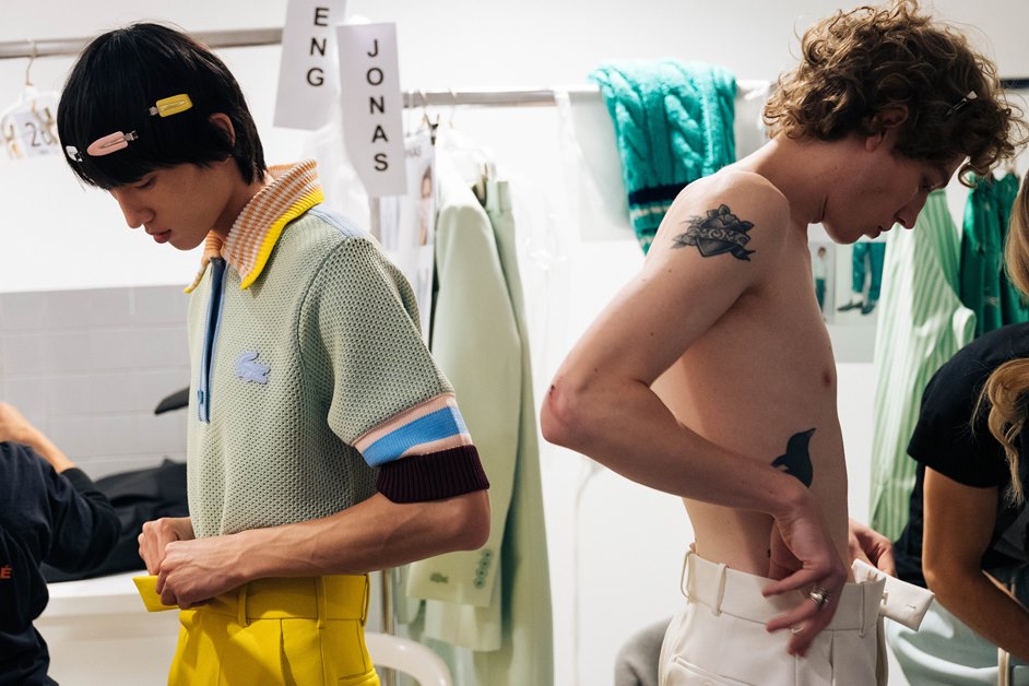 Para a Primavera/Verão 2020, a Lacoste fez parcerias com duas designers britânicas. Os tênis com colagens são confeccionados à mão por Helen Kirkum, uma releitura dos modelos da estação passada em novos híbridos. O crocodilo foi moldado como Alighieri nos pendentes e pulseiras de metal da Lacoste, pelo joalheiro Rosh Mahtani, transformando o símbolo da casa numa recordação totêmica.